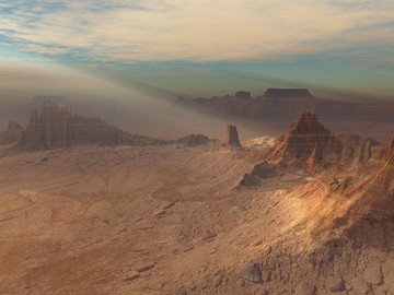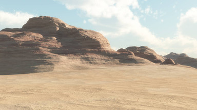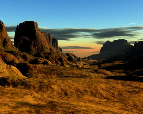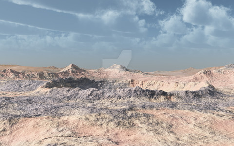 An imaginary desert landscape with tilted rock strata shaped by the wind.Terragen 4.5.71 and Pixelmator 3.1.1