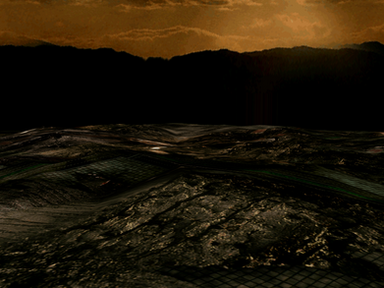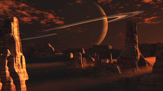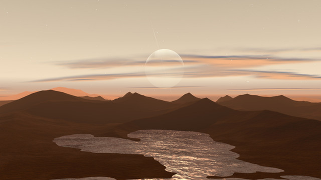 We are standing on the shore of a still nameless methane lake (a "lacus"): It is practically windless, the temperature is around -180° C, the atmospheric pressure is 1.5 times as strong as on Earth, with a gravity about equal to that of the moon. The strange stones, boulders and pebbles are not made of silicate rock, but of ice, it is extremely hard frozen water. The ground is partially covered by reddish-brown „Tholins", complex organic compounds, raining down from the atmosphere.