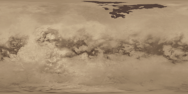 We see a scene which is probably rare (if at all possible?). Titan's strong high-altitude winds have ripped open the usually thick cloud layer and we catch a glimpse of Saturn through the hazy nitrogen/methane atmosphere, which appears about 10 times larger than Earth's moon. Although the sun is shining for the moment, it remains rather dim to our eyes.