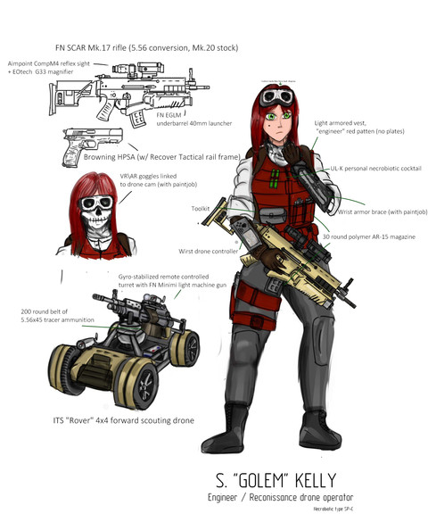 She's very tactical and doesn't like to rush out without a plan. She works well in teams and coordinated assaults, and specializes in infiltration missions. She's had training in CQC including fighting with combat knives (although she doesn't have one starting in sanctum) and martial arts, but she prefers to keep an optimal distance.