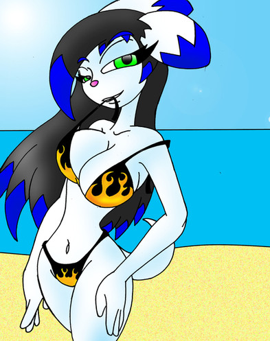 Jessica rarely puts her namesake character in a swimsuit, but when she does the color is red, so I put her in a Pyroball bikini. I guess it also expresses the "hotness" of her character even more.
