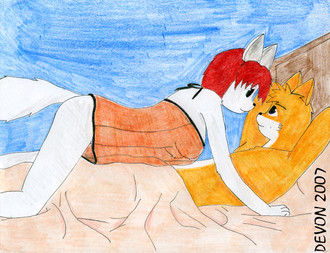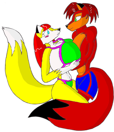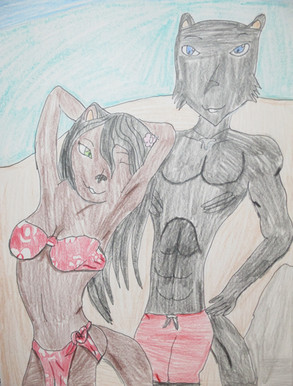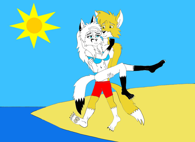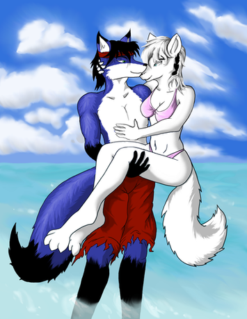It's Sam and Blaze!A classic moment for a husband and wife. Spashing around to carelessly in the ocean, Blaze eventually wore herself out. Sam soon came to the rescure and lifted her out of the ocean and back onto land.
