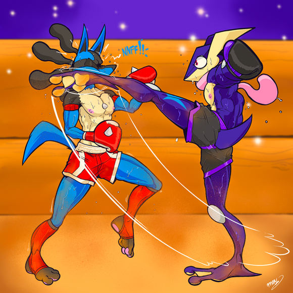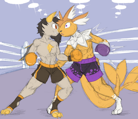 Got a sweet duo panel commission of Devv and Obake boxing in the ring delivering each other harsh blows 💥🥊Devv (Lucario): Me