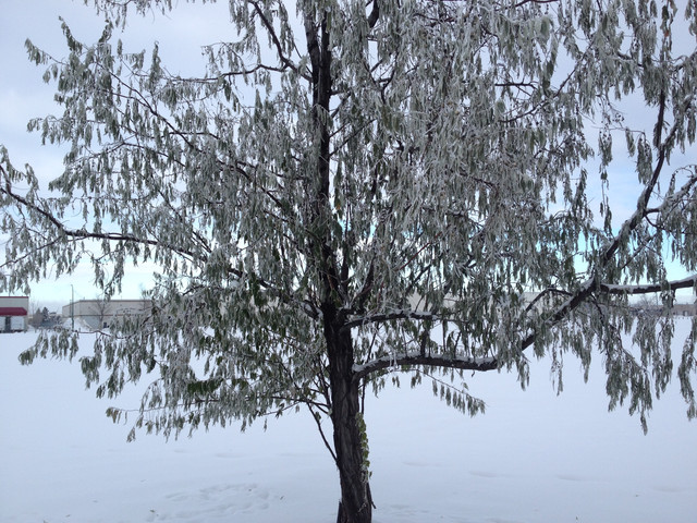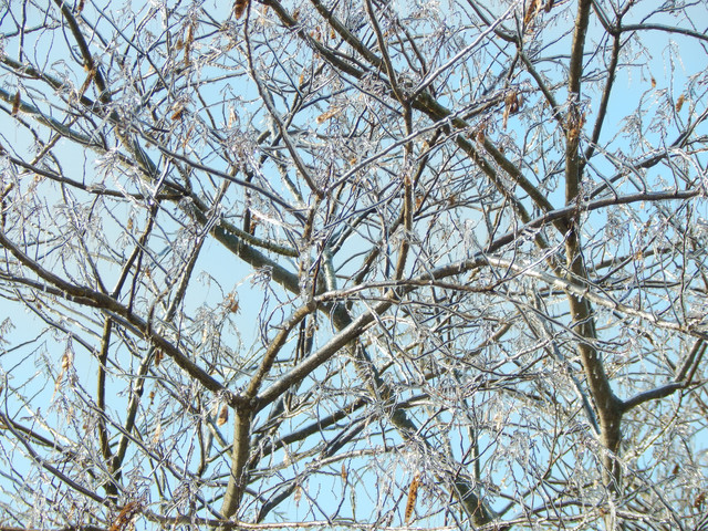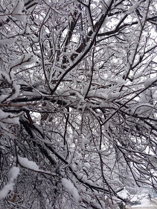 A tree during the winter storm in February. The sky looked so dreary the whole time, just a pale blue-gray. The trees were darker because of the ice soaking them, and their branches hung so low. Many branches snapped off and damaged property and blocked roads. It was all so dull and lifeless. Much quieter than usual, other than the sound of tree limbs snapping off and children screaming.