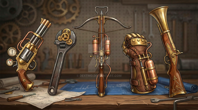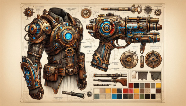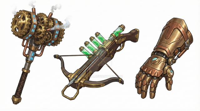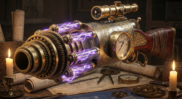 #magic #weapon #gun #steampunk #artificer #blueprint #brass #clockwork #conceptsheet #engineering #gunslinger #rifle #weaponconcept #fantasytech
