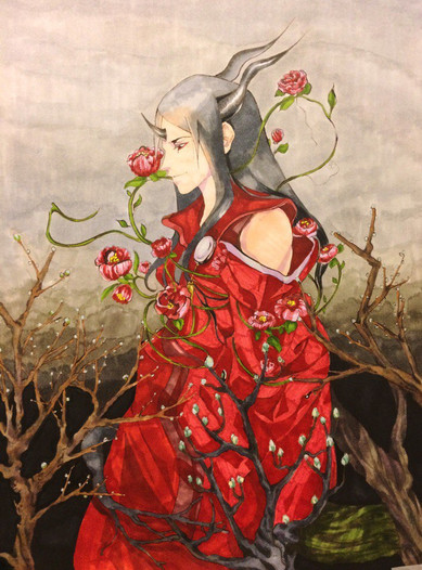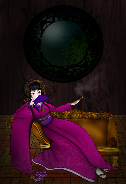 OH MY WORD! ! My eyes BLEED from beauty! Oh my this is stunning! The colors here are so pretty! I just love everything going on in the background! The foliage, the patterns on the vases, that elegant settee - all are incredibly lovely! And Shiori is a complete KNOCK OUT! 10/10!!! The robe turned out beautifully! AND SO DID THE CLEAVAGE And I love her hair and makeup! Completely flawless! Thank you so much for this magnificent piece!!! I'm so grateful and can't wait to commission you again!