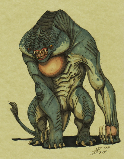 Category 5 and along the size of Slattern. I would say he slightly smaller, but has a denser muscle mass to account for better land speed. In the water he's a barge and ungainly. Get him on land though and he's a threat.