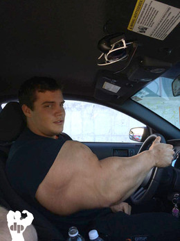 As his friend "services" Kyle, he grips the "Oh Sh@$#" handle. Parking in the woods for privacy was a good idea as Kyle begins to feel his body shudder with bliss. Unfortunately his truck's front driver side support pylon begins to bend under the load of his flexing bicep!