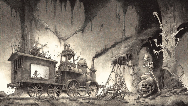 Very nice illustration. As an adult there is something about this which is a bit funny (but creepy creatures with a touch of comedy are often even creepier to me), but for a little kid I think this train will cause nightmares; I like that.