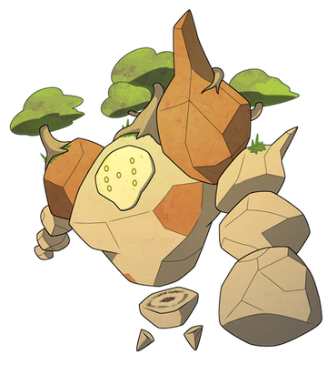 Dex Entry: Despite the main Pokémon being only comprised of the small yellow core inside its very heart, the sheer power of this core is able to outclass modern technology by far. The exterior used to channel its power was designed and built by an ancient civilization way ahead of their time, constructing a Pokémon so powerful it destroyed entire landscapes, only to reform them as islands floating around its body.
