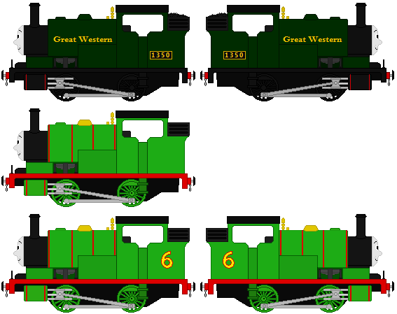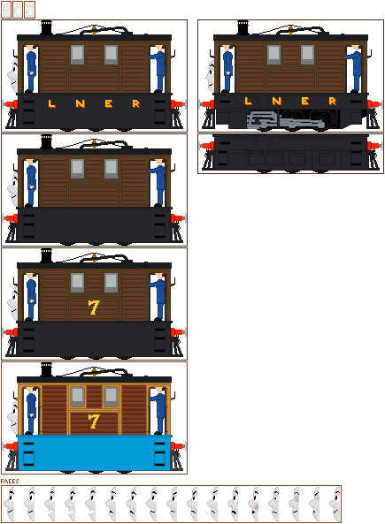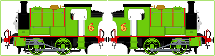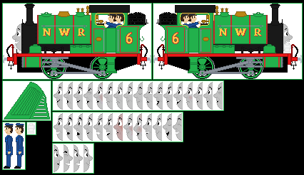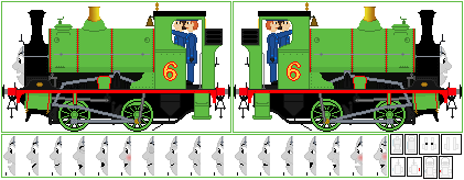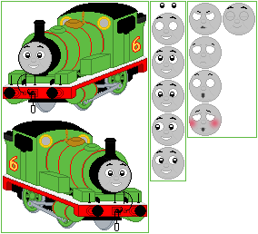 Here's a sprite of Percy the Small Engine, as he appeared in the Railway Series books. Includes separate lamps and changeable faces, nothing more! I only added a name plate on the sides of his tanks, and that is all.UPDATE: made edits to a few faces, changed shape of dome, made a few minor tweaks to the cab (the inside of it) and changed the colour of the coupling rod bolts from green to grey to match the rest of the valve motion/rod assembly.