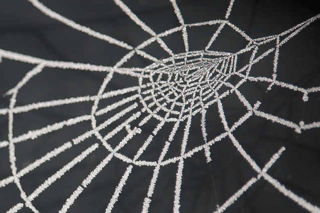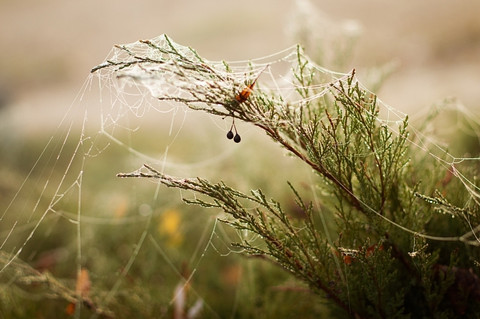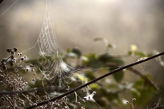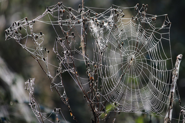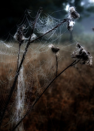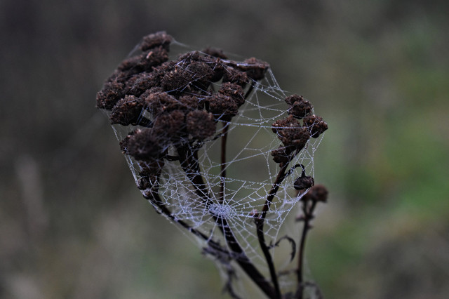 Three witheredΒ ordinary teasels (germ. Wilde Karde, lat.Β Dipsacus fullonum), bounded in a World Wide Web.Autumn, time for spiders, melancholia and passing!