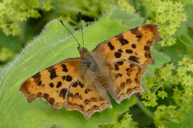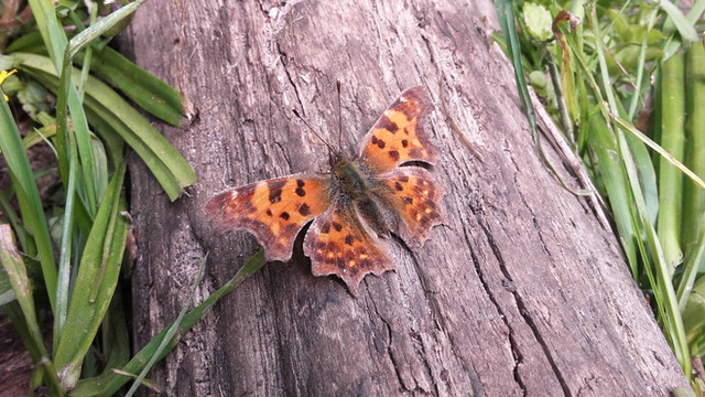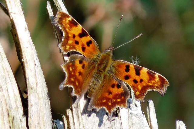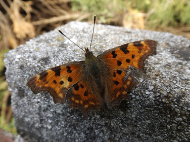 A comma butterfly (lat.Now you can see the little white "C" underneath the wings, looking like a comma and giving this wonderful butterfly the name.