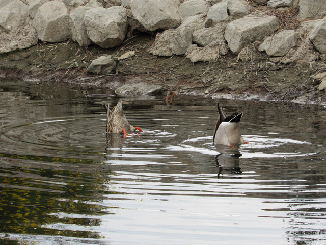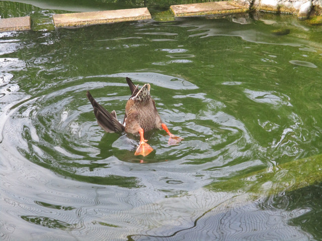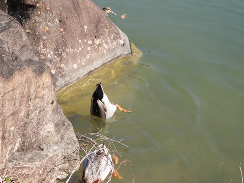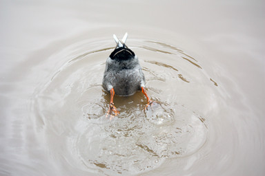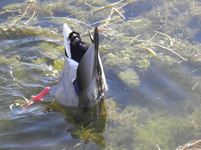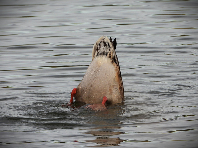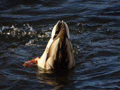 Dry feet and wet head! A bathing duck looking for a meal.Related content