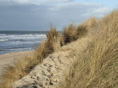 Small dunes, formed by the wind on the beach of the isle Sylt in the North Sea.The beach grass is for bank protection.