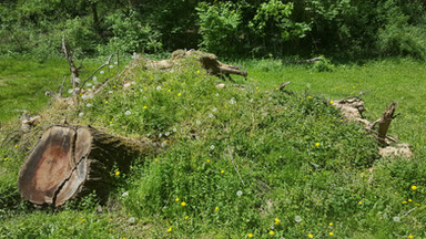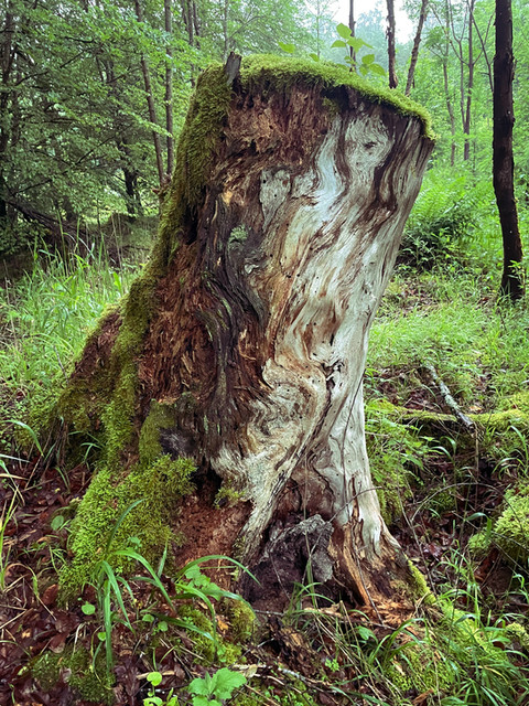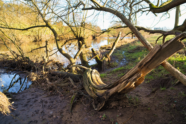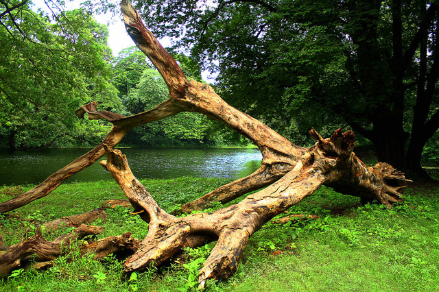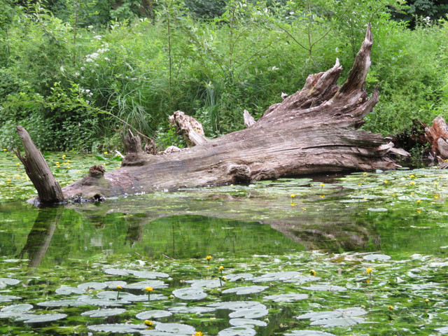The root of an overthrown tree among the growing green of nettles and grass.In background the river Weser.
