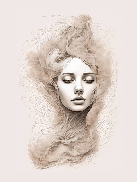 The design on her hair is quite enigmatic it has the appearance of waves in the sea the way it seems frozen in flow. As though if we were to see her the waves would undulate from her head.