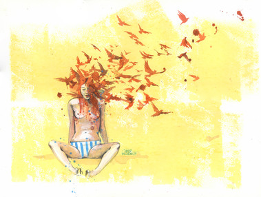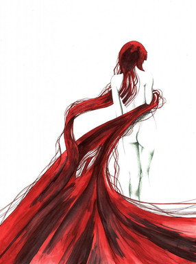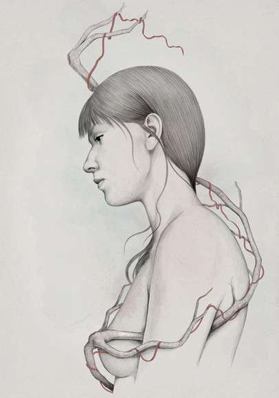Oh that's pretty. Love the almost two-tone-ness. The red/pink things popping out at me gives it a nice effect^^ I love the subtle adds, too, like the vines/tattoo on her leg and the branches in the bg. Great work!
