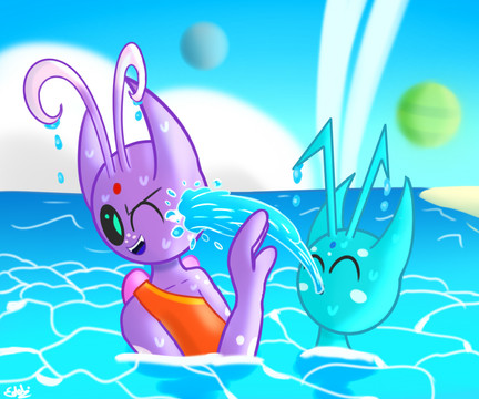 Make this for a friend cuz I adore his character Zigit so I drew him and Libra having a pool day, it’s not finished but I honestly don’t wanna finish itZigit is the blue guy, Libra is the pink&black gal