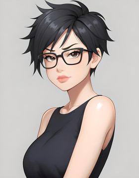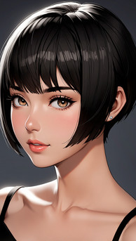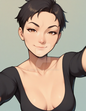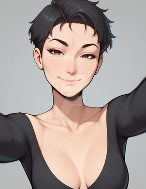 #blue_eyes #breasts #cleavage #collarbone #forehead #freckles #gradient #mole #shirt #smile #solo #1girl #black_hair #grey_background #black_shirt #looking_at_viewer #short_hair #closed_mouth #gradient_background #upper_body #medium_breasts #mole_on_breast #mole_under_eye #mole_under_mouth #mole_on_neck