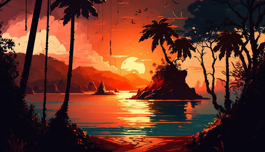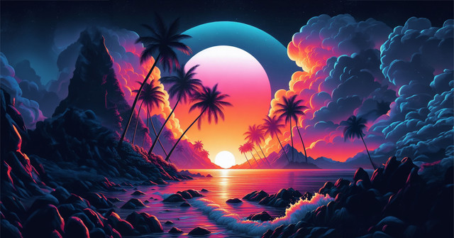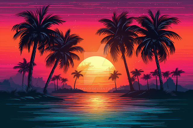 #wallpaper #1980s #artwork #beautiful #clouds #island #landscape #mountains #neon #ocean #outdoors #palmtrees #paradise #retro #scenery #sunset #tropical #vibrant #water #retrowave #synthwave #vaporwave #1980sinspired