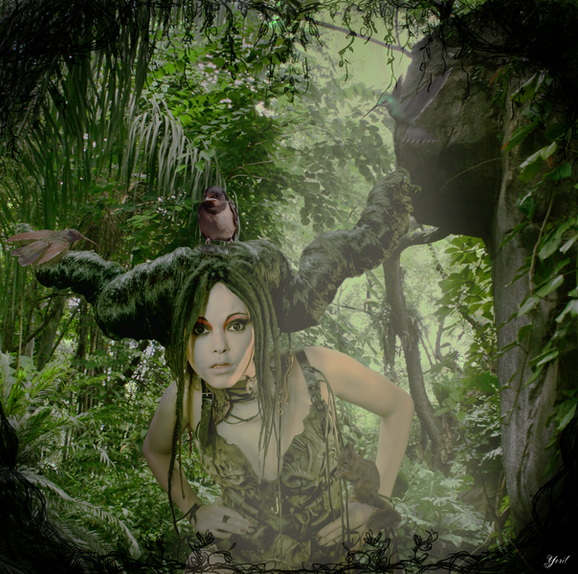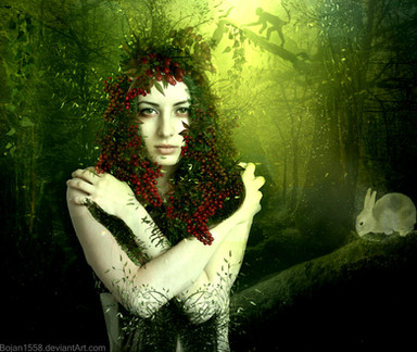 This looks good. You did a very nice job of keeping the animals in the right size in comparison with the nymph. However, it's a little off balance as far as colors are concerned. Putting some of the same flowers, or different flowers in the same colors, on the right hand side will help pull the eye to that side as well to make it a better balance image. Otherwise, the eye will stay on the nymph and the animals. The large face becomes less important, and getting color on the right hand side will help with that as well.
