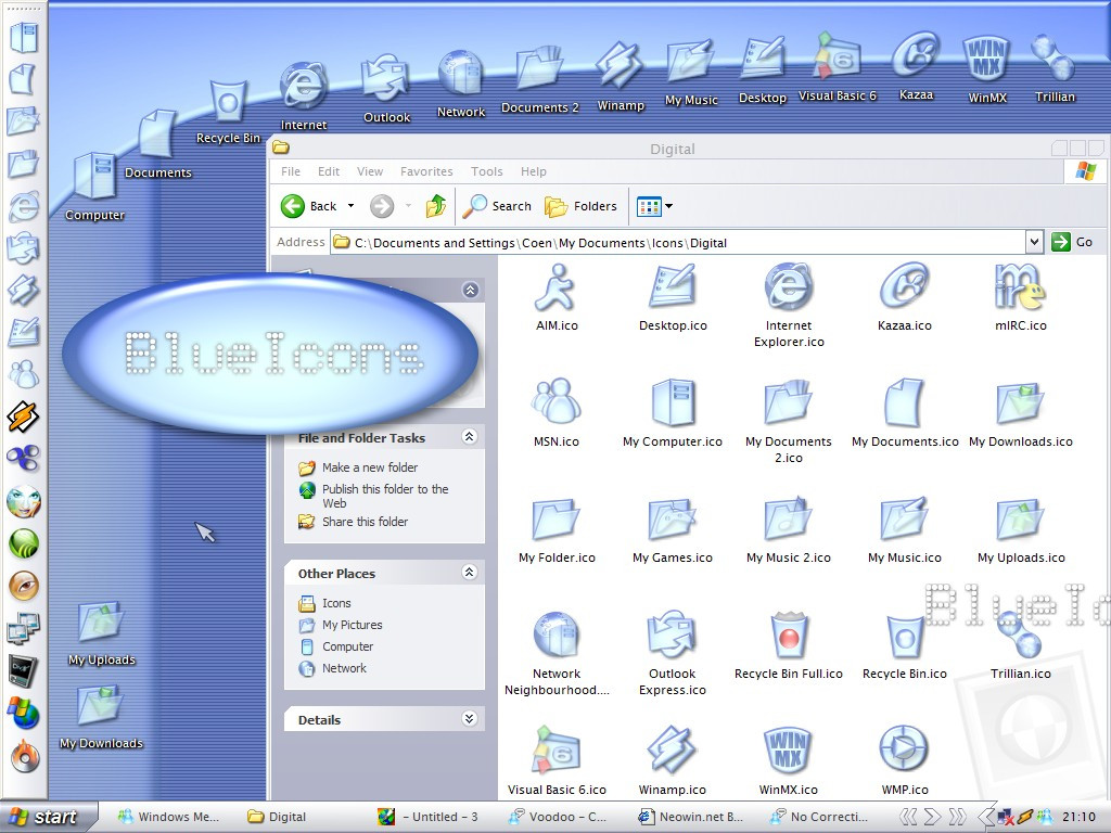 Here is some early work from my Blue Icon PackAll Icons in all sizes from 16x16 up to 128x128, alpha blended, 25% transparent. Meant for use in Windows XP. Check the screenshot!