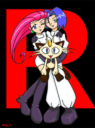 What I like. Remember how I said the faces kind of look flat. Well, everything else looks great from a volume/mass/3 dimensional aspect. The bodies have good height, width and depth. Sure. It's cartoon manga. But it's GOOD cartoon manga with volume, without looking like a computer animation. That's very nice and it works well for me. The composition is nice too. While I might not like the line of sight being at the same level as where the feet touch the ground, you do an excellent job of keeping that perspective as the eye travels up, including keeping the three dimensional aspects of the "R" consistent. It would have been easy to just make that a 2 dimensional "R". Placement and pose of the figures works really well for me also. If James' right arm was down, and Jessie's left arm was up with her hand on her waist, they would be mirroring your "R", which MIGHT be cool, or might not. But what you have, definitely is. This one just works better for me on so many levels, but again, while I can point out a couple of things I like, from a technique standpoint, I can't tell you what you have done differently on this that makes it look so much better to me. But it does work, and quite beautifully. Wish I was more helpful. (Oh...the reflections on the floor in the foreground...nice touch.)