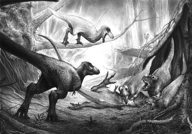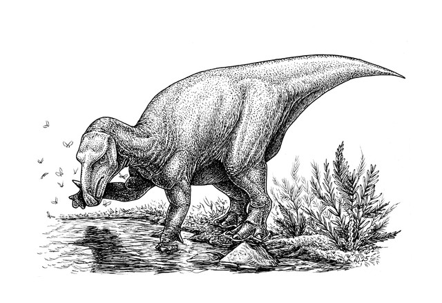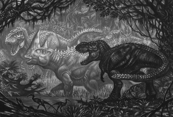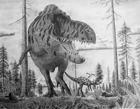 For those who love retro. Based on scale model of a Tyrannosaurus rex exhibit which was planned by the American Museum of Natural History but never executed. (Osborn, H.F. 1913. Tyrannosaurus: restoration and model of the skeleton. Bulletin of the American Museum of Natural History 32: 91-92.)Traditional graphics, paper also aged by hand. This picture was made as a gift.