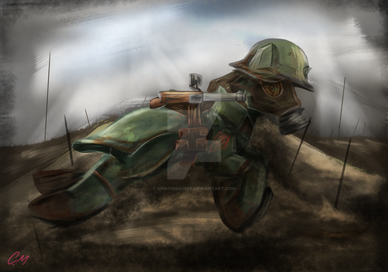 The world is quiet, muted, the only prevailing sound currently the loud sound of his breathing through the mask over his face. The need for the mask, all too sickeningly clear beyond the tinted glass goggles, is a field of off-yellow gas that floats almost lazily upon the soft breeze stirred up in the absence of the fighting. Looking around slowly, the stallion cannot help but admire, in some cold and distant fashion, the effectiveness of this new invention. Gas weaponry had not been active on the battlefield for long, but for all the time it had the stuff had been more effective, and in many ways more destructed, than even heavy artillery.