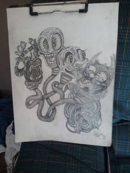 the feathers are out of place, if i redraw this character, he will either not have feathers, or will have them arranged in a nicer fashion ... yes, he is a floating head ... in his past version he licked light bulbs