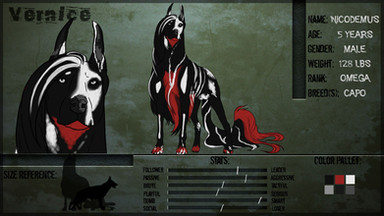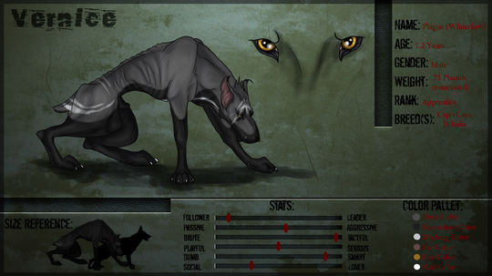 Personality: Pleite is a quiet, careful being of perpetual motion. His anxiety at all times is palpable; he paces and pants and pulls out his fur if he can't pace. He is incredibly self conscious of his appearance and actions, and he seeks nothing but acceptance from those around him. Because he's constantly on edge, it doesn't take a lot of pressure to push him over the edge and make him crazy. His mind slips into a place of self-preservation and he fights and bites and tears to try to escape and ease the pressure. When he calms he is incredibly ashamed of his actions, and his remorse is crushing. His mental state is questionable at best, but he's easily calmed and reset by a friendly dog and some friendly touch. He misses his master desperately and is excited by the idea of human contact, but most humans shun him in fear of his scraggly appearance. When he relaxes and can see clearly, he is a fun dog to be around that loves to play and run.