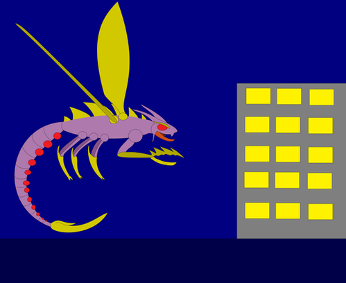 Tokyo, one of the busiest times of the night, people doing mundune stuff of trying to get work done as soon as possible, many don't know there is an insect creature in the sewers, so far its been feeding on sewer rats, but they're not enough to substain it, so it looks for bigger prey. A stray dog wanders the streets looking for a meal, it senses something, growling at something in one of the alley ways, only to realize too late the insect creature had made its move, only indication was the sound of trash cans and dumpsters being damaged, the owner of the building comes out to investigate the racket.