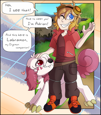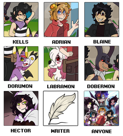 Ah what better way to start uploading here again than with THEM -grabs them and shakes them around like a toy-This is Kells! They're my player character in the Digimon-theme DND Campaign that EctoHaunt DMs! They are also, of course, one of the main charas in the webcomic we're making based on the campaign! They're curious, peaceloving, reckless, and they absolutely leap before they look. They are a HUGE DORK and also they're main Digimon partner is a Dorumon! Though they also have a Pulsemon and a Kudamon!