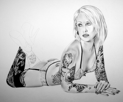 It is finished... and it was tough, challenging, frustrating, exciting, wonderful... just amazing. I had a lot of fun drawing all those tattoos, although sometimes it was really difficult. My hand hurt sometime, but I think I really managed it! I am pretty proud of this drawing!The model is the beautiful Andi Lyn ([link] ), who I met at Comic Con 2010, and promised to do a drawing of her, and the photographer is my good friend Robert Alvarado