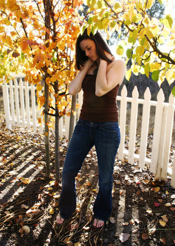 great position for the photo and love her hair and skin tone in contrast with the trees and cold ground ^_^