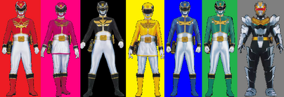 Mega Rangers and their Super Mega Mode with Robo Knight in the center.From Left to Right we have Troy, Gia, Noah, Robo Knight, Emma, Jake, and Orion.