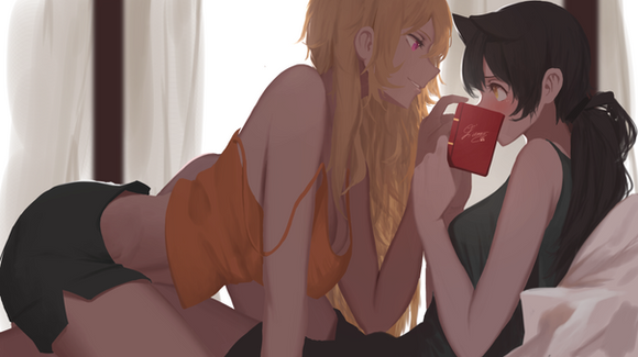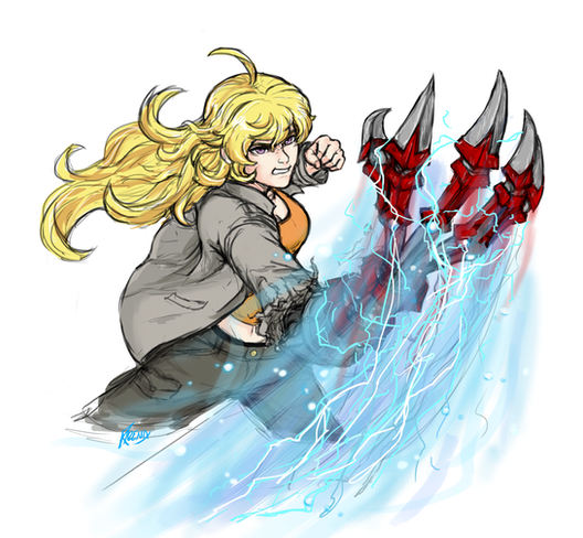 Why does Yang take xiao long in Vol. 4 to reunite with the group? I believe the artwork can offer a 'sheen in the light' to that mystery. Perhaps before she finally 'hits the road-jack', she was busy 'cracking the pavement' with her own jack-hammer. Her method has gotta be a secret mode activated by a special phrase. I assume its called: bumblebee mode 'turned on' by pass-code: bellabooty. Just imagine that sound of enlightenment giving off its divine hum. What am I talking about here? Pet the kitty, and you hear it meow. How appropriately inappropriate!