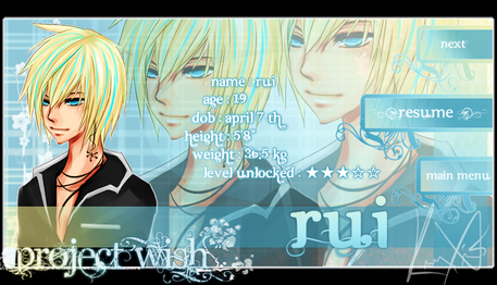 What is PROJECT WISH? Well, it's a 'mock' dating sim/ visual novel (maybe) that I'm trying to make. Rui's one of the character that you can end up with and stuff. So yes, he's datable.