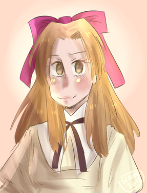 The portrait, trough it's simple design, gives a complex and harmonic view. One such example would be the clothing details, which are pretty accurate. Something really impressive at what you created here is the shading. The hair and the bow tie have a perfect lighting as well and really gives the desired detail to it. As for the expression, as I mentioned up, tho it's simple, it expresses a lot and gives a small peak to her persona. Returning to the shading, one more bonus to it is that it's done with the light coming from the front. Many people tend to do it from one direction (I admit I do only that). My point here is that you managed to keep the same perspective with accuracy and it is admirable.