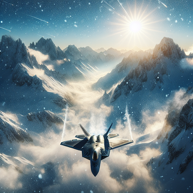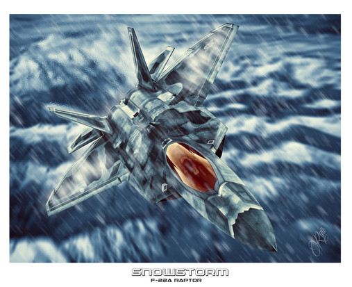 An F-22A raptor flying in on a clod day through snow flakes that are falling on Pioneer Peak in Alaska.