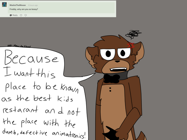 Freddy: Oh for god sake! That was the MIAH Freddy! Not me Dumbass!
