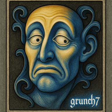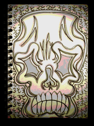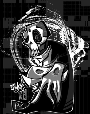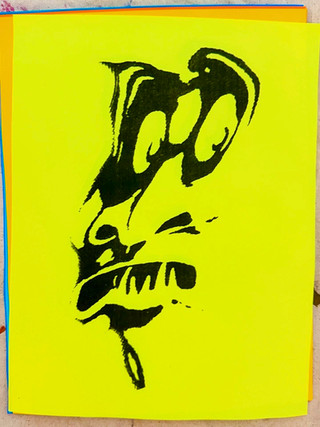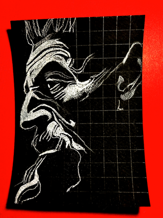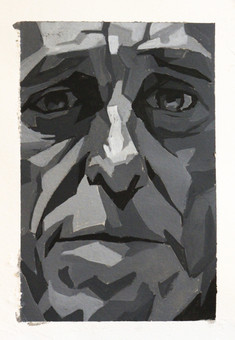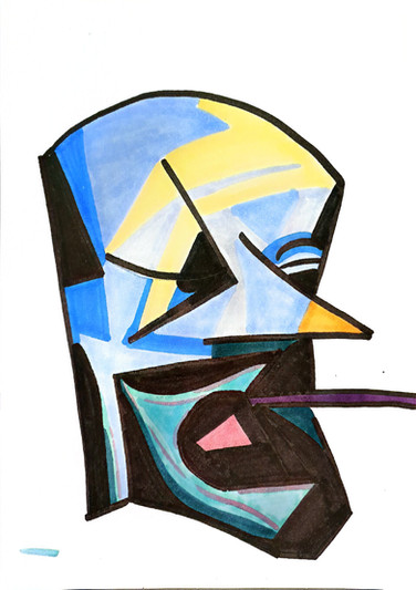 Angular, sharp, and swerving at the corners with ribbon-like attributes; the sixth painting in the Ghost series displays a dark condescending scowl falling upon the viewer with the twisted eyebrows and crooked lips...8"x10" Acrylic on canvas