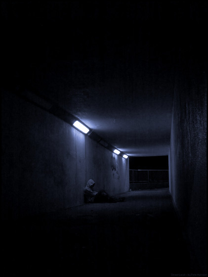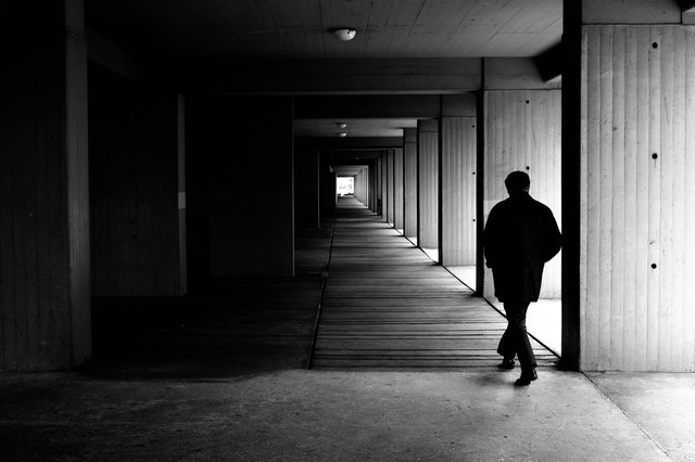 This shot is extremely well done! The darkness, and the light, and the person... everything in the right place, I say.
