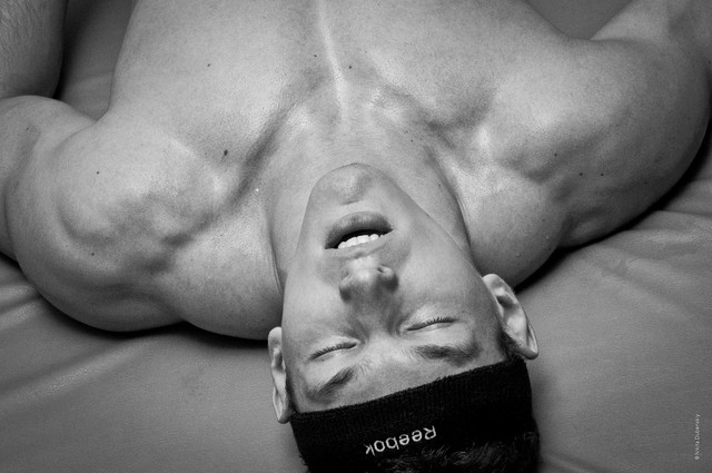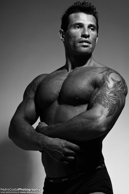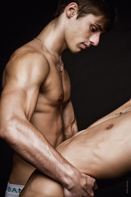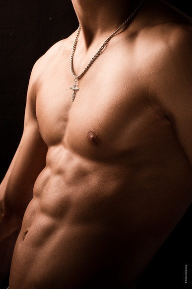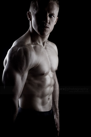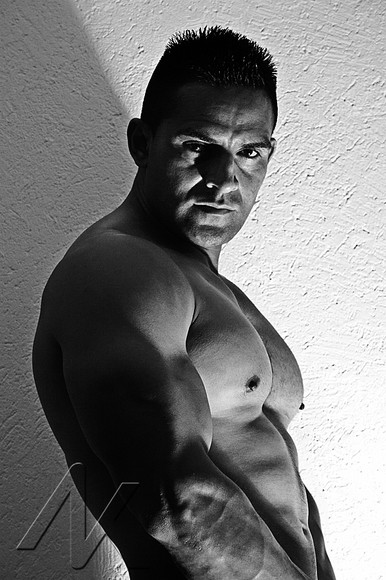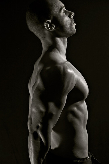 The high-resolution details seen here (for example, the water droplets) is great. The angles and curves of the model are accentuated nicely by the lighting and his pose.