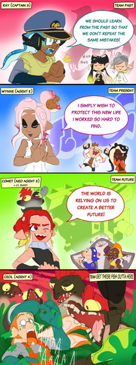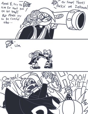 Frye's whole fan club is in the second panel! Wow!!I think the concept of putting any member of Deep Cut in charge is fantastic. Like, they run the Anarchy Splatcast, for one. Shiver would be nothing less than a ruthless monarch. Frye would spend the entire treasury in a matter of weeks. Big Man might forget he's in charge until his term is up, leading to, y'know, more anarchy. Either way, whoever wins this Splatfest will definitely have the bragging rights to annoy the rest of the fans.