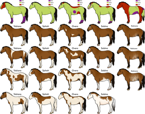 - You will often see the genos containing a dash ( - ). The dash is a placeholder for a different gene within that locus. They are there to let you know that it doesn't matter if the horse is heterozygous or homozygous for that gene. Example: A black tobiano's genes may be written as Ee/aa/nTb. This horse is heterozygous for black (Ee) and tobiano (nTb). But for the expression it doesn't matter if the horse is heterozygous or homozygous, so in these guides it would be written as E-/aa/Tb- ! (note: in this horse it DOES matter whether they carry agouti or not, since with it the horse would be a bay!)