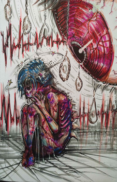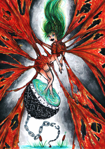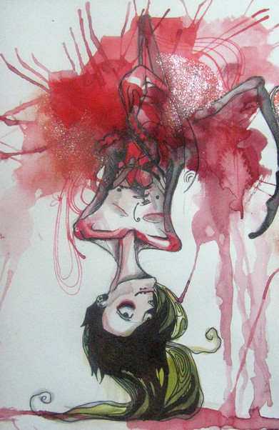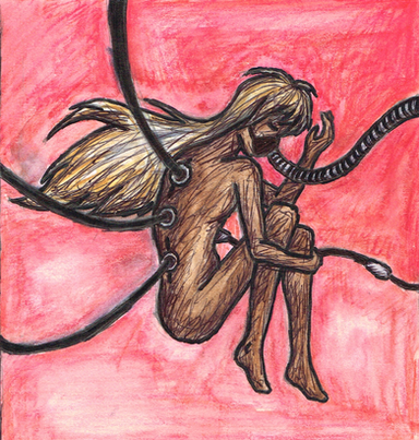 Hmm.. I like this, I knew as soon as I'd drawn it that it had to be done in watercolour. I sort of like that the colours ran a bit, it gives it a murky feel, as if the blood is running into the fluid in the picture.Apollyon's back is split open, there is no skin exposing the muscle, that's what all those lines are. Her bottom jaw also has no flesh and is stitched up to the bone.