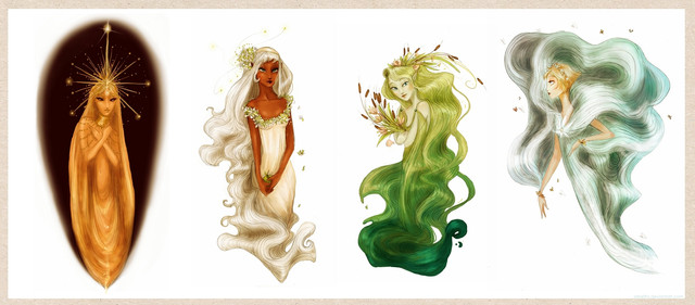 'Water' is least successful at combining element and person, seems to be wearing his element rather than being connected to it. Fire most successful, Air is also good thru representing element