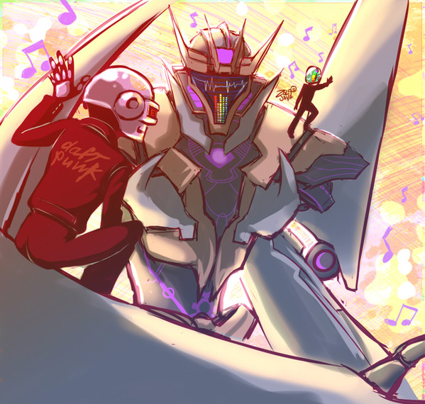 Dude,this drawing is cool,I love this 2 elements Transformers + Music,but the blue haired BITCH ruins everything for me!!!